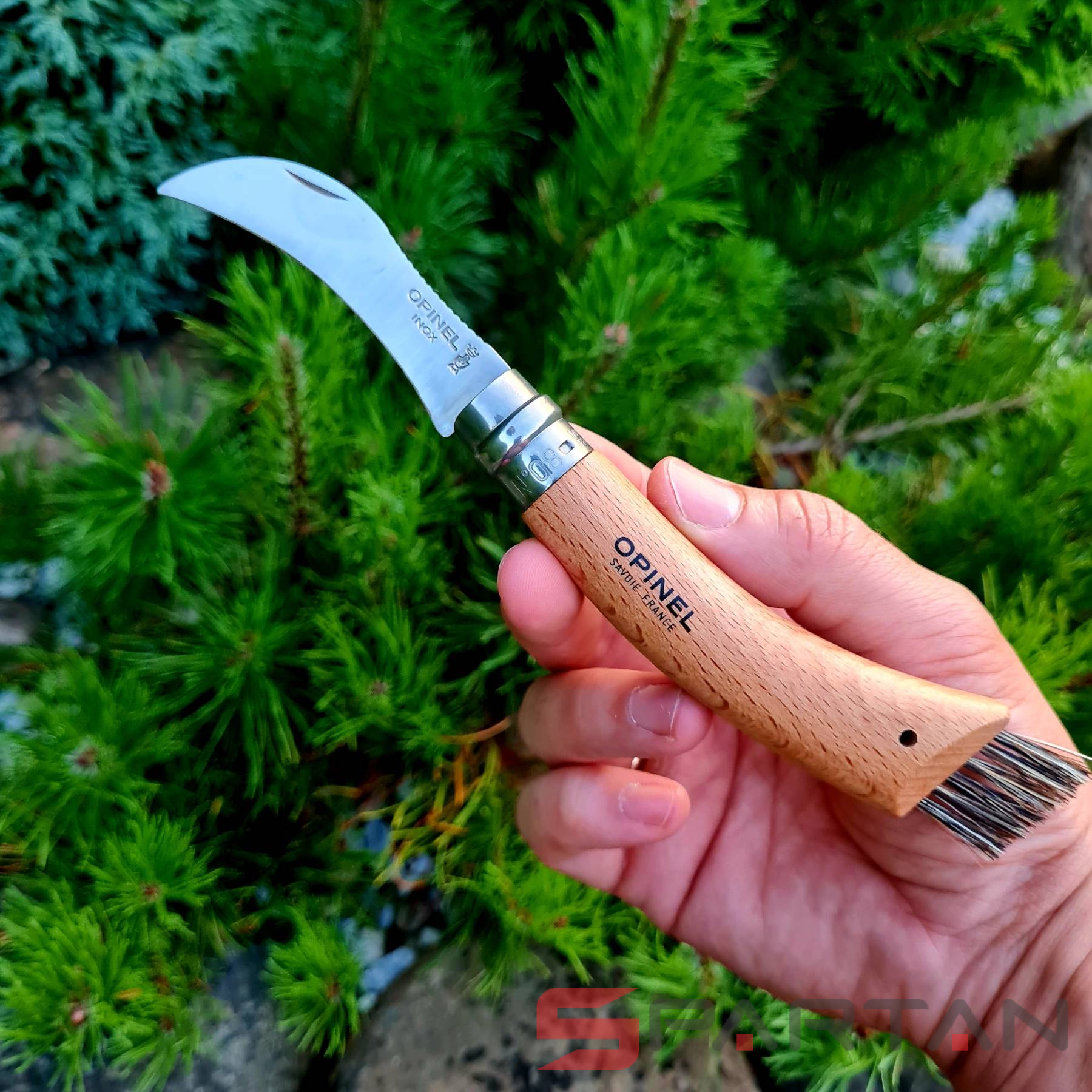 Казалось бы что для похода за грибами не требуется особый нож, но французские ножеделы из OPINEL считают иначе. Складной нож грибника Opinel 8 INOX Mushroom таит в себе несколько интересных усовершенствований. На тыльнике рукояти размещена щеточка для очистки грибов от листьев и иголок. На обух ножа нанесена насечка, которая применяется для чистки грибов в полевых условиях. Вогнутым клинком удобно срезать грибы на толстой или тонкой ножке. Компактные размеры и небольшой вес, позволяют носить нож в кармане, не испытывая дискомфорта. Впрочем при желании можно приобрести фирменный кожаный чехол OPINEL Outdoor L. Сталь клинка нержавеющая, так что опасаться коррозии после прогулок по осеннему лесу, не стоит.