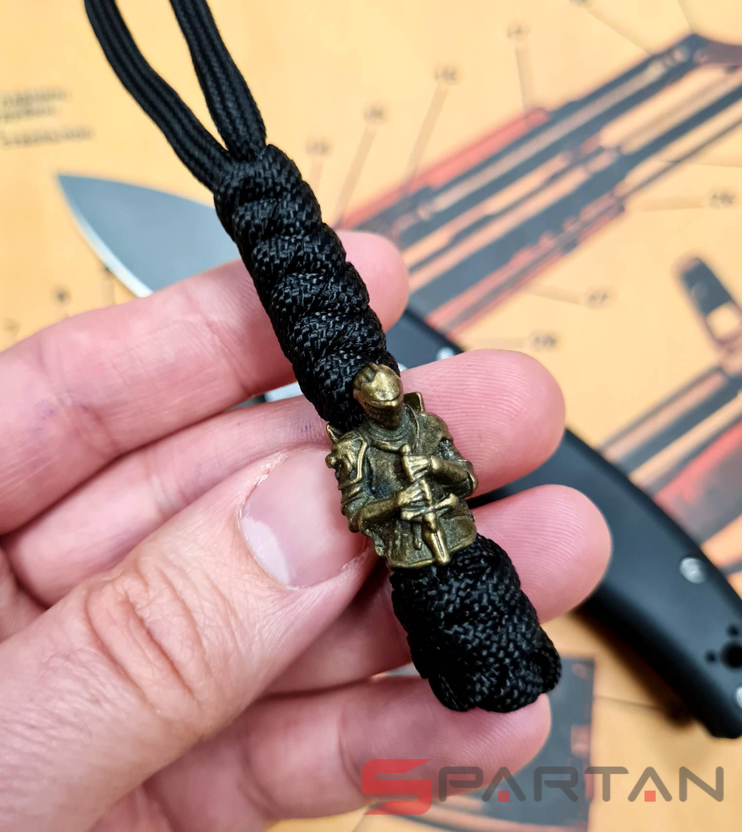 Стильный и оригинальный темляк из паракорда. Бусина из латуни в виде рыцаря со щитом на спине. Предназначен для подвеса на нож, для более удобного и быстрого его извлечения из кармана или ножен. Кроме того, увеличивает надёжность удержания ножа в руке. Стильный аксессуар также частенько используют в качестве брелка для ключей, сумки, фонаря. Полностью ручная работа, существует в единственном экземпляре. Модная тема среди любителей EDC-ножеманов.